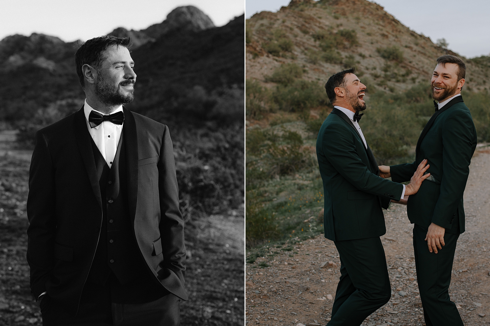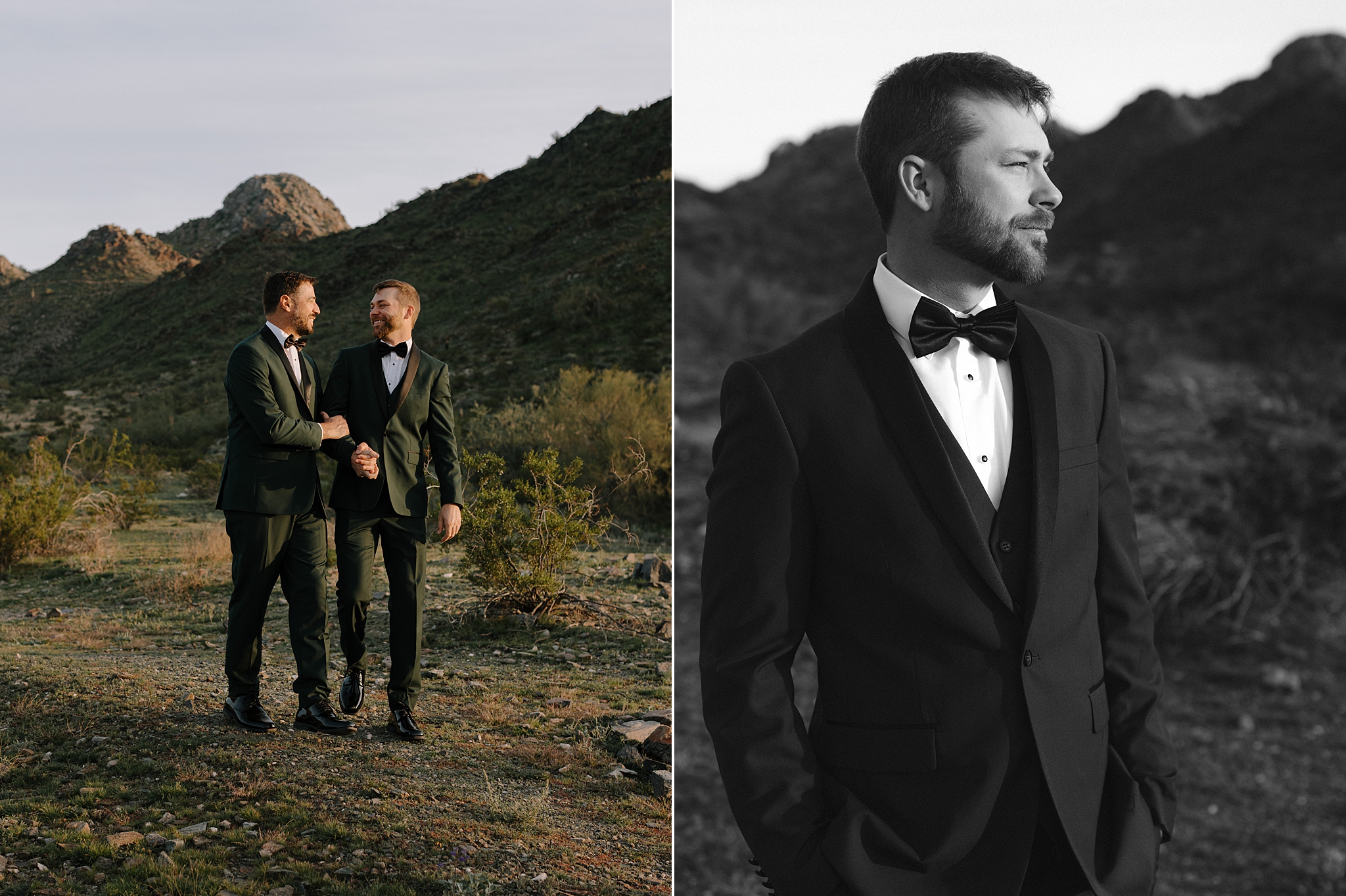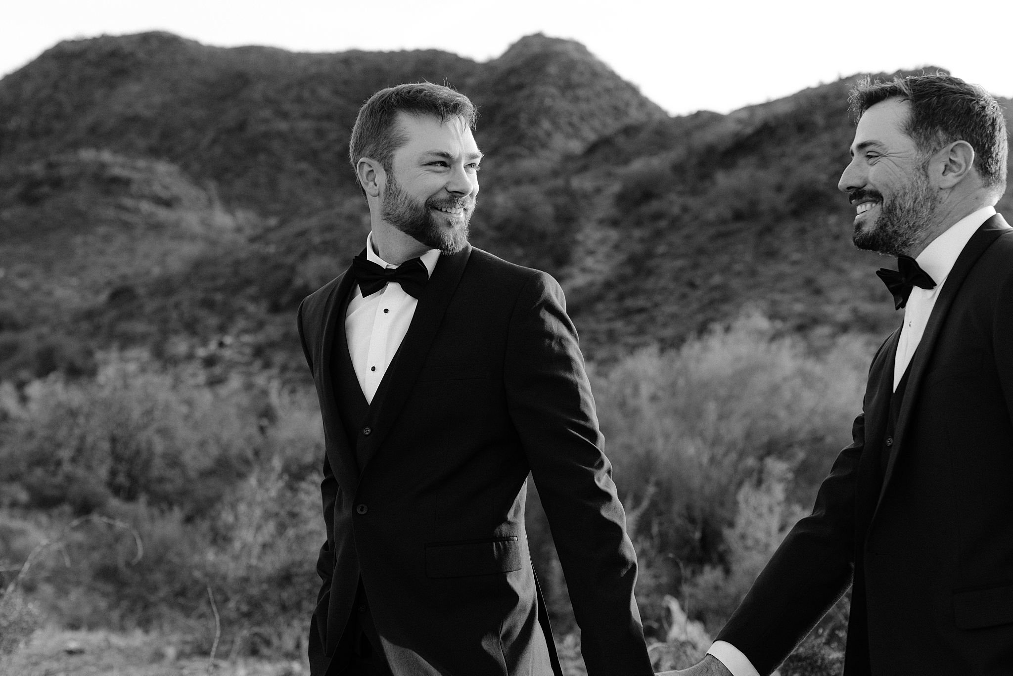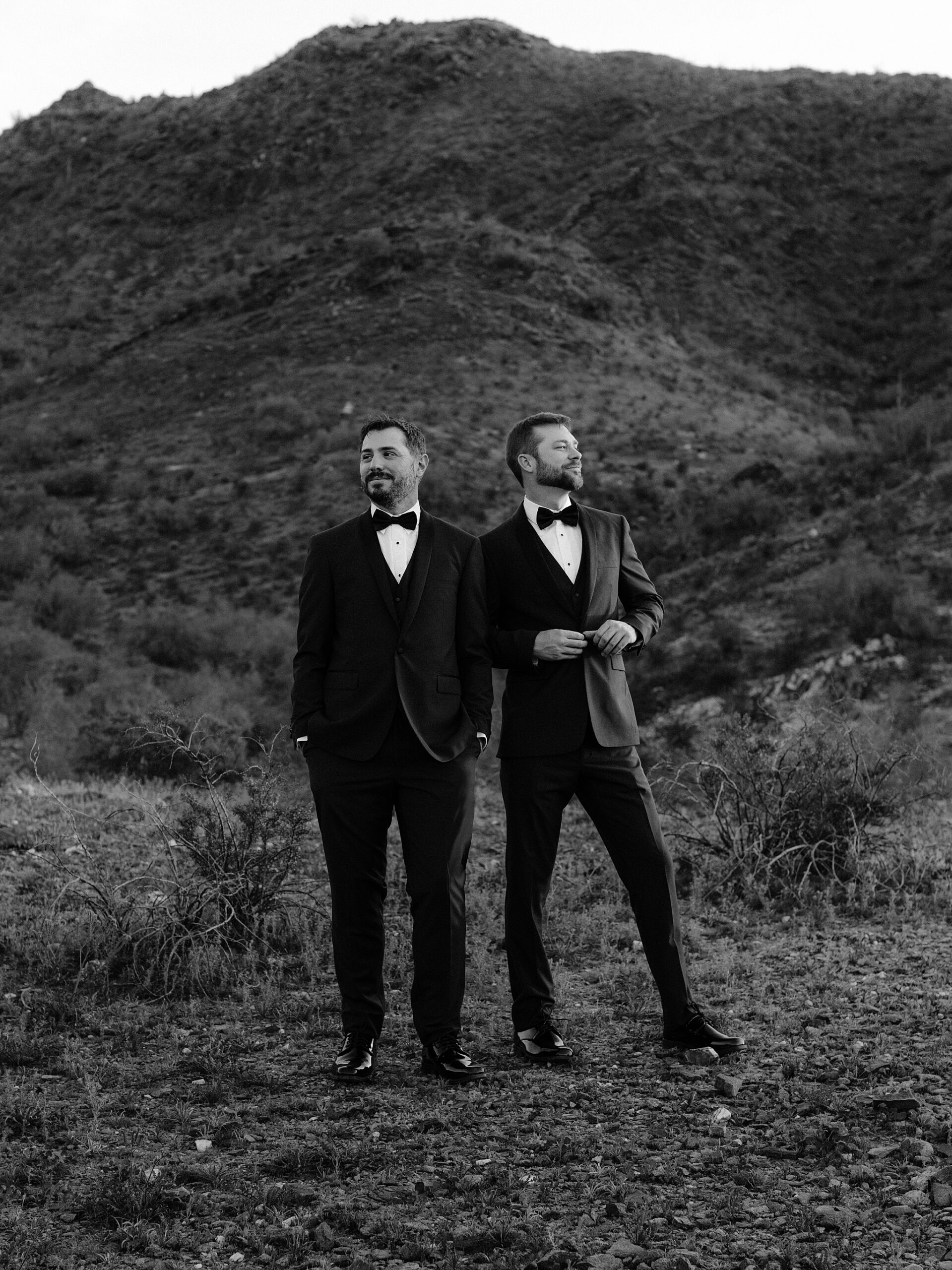 Intimate black and white portrait of two grooms before their wedding ceremony at Whitfill Nursery in Phoenix